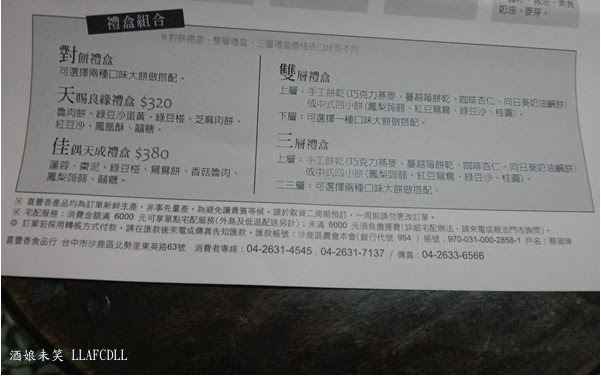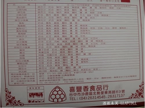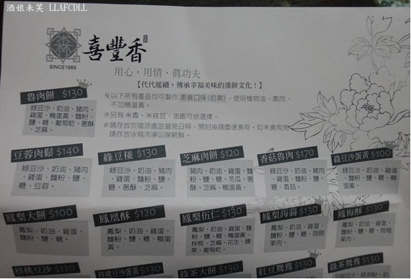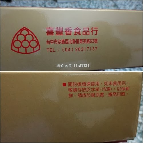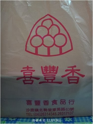 麻糬非常地軟Q,肉鬆不會難咬,很好入口, 紅豆沙不甜膩,入口即化,若是再搭配鴨蛋黃一起入口,味道就會剛剛好. 以內餡來說,我還挺喜歡這兩款餅的. 不過,因為竹南的麻糬餅是酥皮的, 所以,吃到這樣的外皮,我跟老媽都有點吃不習慣哩! 不過,以價錢來說,店家的大餅算是便宜又好吃, 想要訂喜餅的人,可以上門試吃看看! P.S. 自民國103年1月1日起, 一斤傳統漢餅均調漲10元, 奶油酥餅調漲5元(片) ====================================== 店名: [台中沙鹿] 喜豐香食品行(紅豆鴛鴦餅/魯肉餅)(囍餅) 地址: 台中市沙鹿區東英路63號 電話: 04-2631-4545, 04-2631-7137 營業時間: 08:00--21:00 停車: 機車,汽車皆易 官方網站: http://happycake.com.tw/ 官方臉書: 喜豐香喜餅