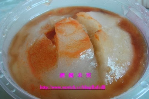 左邊的白醬是甜的,右邊的紅醬是辣的.