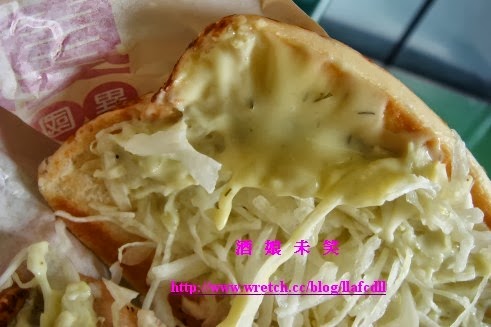內部有高麗菜絲,一片鮭魚,醬汁.