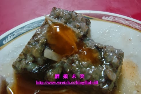 店家的米血上,放有一小撮薑絲,還有淋上醬油膏.