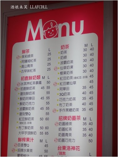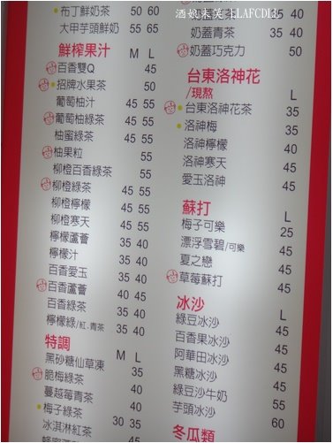 由左至右,分別是台東洛神花茶(L 35元),招牌水果茶(L 50元),紅豆奶茶(L 45元)