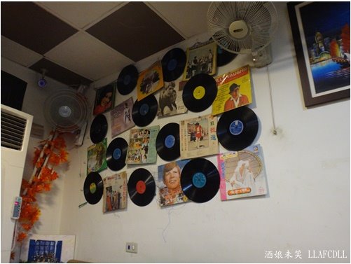 牆壁上有一些黑膠唱片,挺復古的