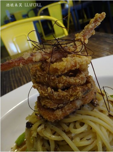 上面有酥炸魷魚,最上方是油炸辣椒絲