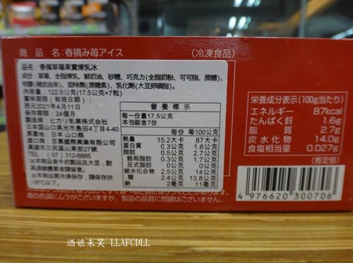 成份:草莓、全脂煉乳、鮮奶油、砂糖、巧克力、明膠、甜味劑、乳化劑