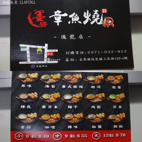 當天上門買的顧客還挺多的, 店家的章魚燒是現點現做的,要稍等一下. 請先跟老闆點餐,記得要挑章魚燒的口味哦. 攤子正上方,就有各式的口味 點好之後,先結帳,店家會給你一個號碼牌. 等章魚燒製作好之後,再憑號碼單取餐即可 店家的章魚燒有專門的盒子裝, 上面會畫上口味 左上角有店家的line 大盒(12粒70元) 這一盒是海苔口味 最上面會有美奶滋,柴魚片 趁熱吃,柴魚片會在章魚燒上面跳舞. 這一家章魚燒皮煎得香酥,裡面的高麗菜內餡口感鬆軟, 再搭配QQ的章魚塊,海苔,柴魚片,美奶滋,是非常好吃的章魚燒 大盒(12粒70元) 這一盒是香蒜口味章魚燒 店家的章魚燒就是原味章魚燒,再撒上各式粉類, 最後,會再擠上美奶滋,柴魚片 章魚燒皮煎得香酥,裡面的高麗菜內餡口感鬆軟, 香蒜口味的章魚燒略帶點蒜味香, 不過,與甜甜的美奶滋比較不太合, 還是比較推薦原味或是海苔口味,會比較美味. 店家的章魚燒味道挺不錯的,味道與日船章魚小丸子略有所不同, 喜歡吃章魚燒的人,可以買來試試. p.s. 日本的章魚燒外皮都軟軟的,還是台灣的章魚燒好吃多了 店家的名片 =========================== 店名: [苗栗後龍] 墨醬章魚燒(後龍店)(章魚小丸子)(龍清書局對面) 地址: 苗栗縣後龍鎮三民路133-1號 電話: 0971-032952 營業時間: 15:00--22:00 停車: 機車易,汽車稍難 官方臉書: 墨醬章魚燒《後龍店》